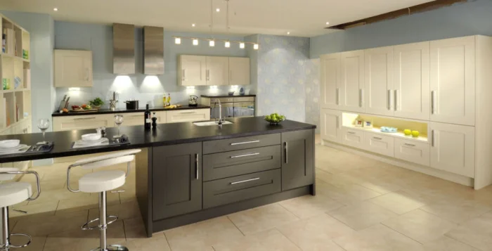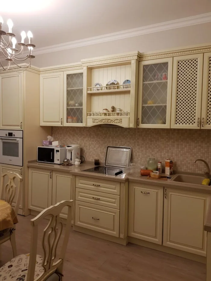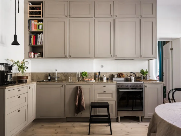 - Солнечная, южная кухня? Выбирайте оттенки с холодным подтоном (пепельно-бежевый, серо-бежевый). Мало света? «Согревайте» пространство теплыми тонами (кремовый, карамельный, песочный).