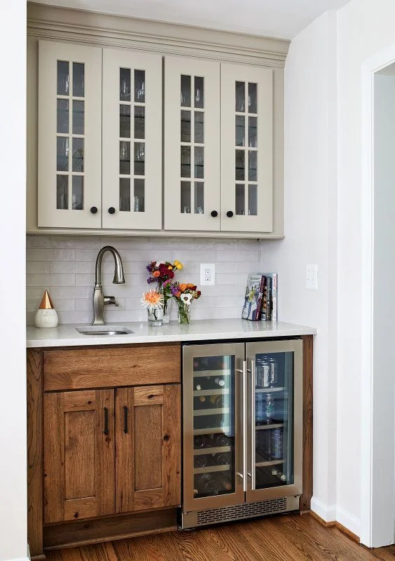 Плитка – это поле для экспериментов. Попробуйте сочетать коричневые и серые модули, перекликаясь по цвету со столешницей или фартуком. Получится стильно и динамично.