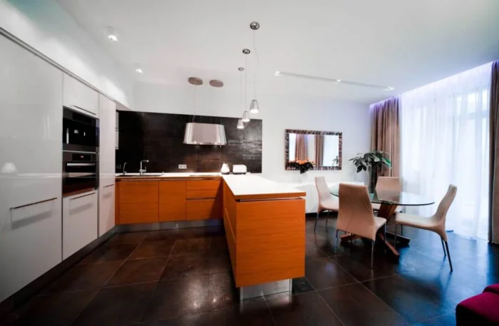 Разная отделка. Простой и эффектный прием. Рабочую зону (фартук) облицовываем практичной плиткой, стеклом или металлом. А в обеденной зоне даем волю обоям, декоративной штукатурке или краске. Пол тоже можно разделить, используя разные покрытия или хотя бы цветовые акценты.