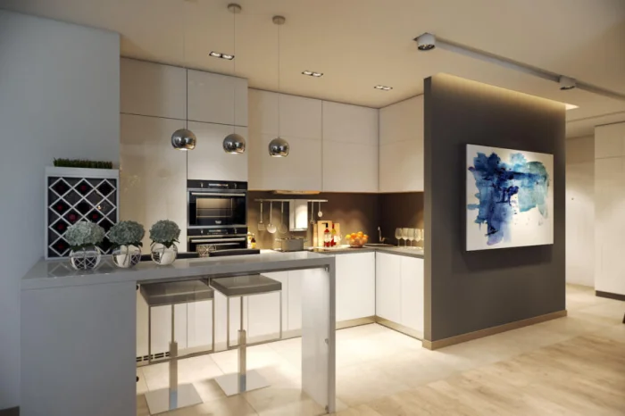 Барная стойка. Элегантный и современный способ зонирования. Идеально для квартир-студий. Она и разделяет пространство, и служит дополнительной рабочей поверхностью или местом для быстрого перекуса.