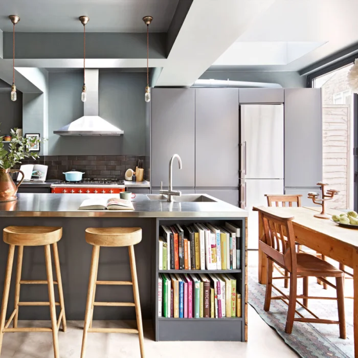 Это не просто стиль, а философия. Речь о том, чтобы собрать кухню не из готового гарнитура, а из отдельных предметов: комода, буфета, открытых полок, острова (если поместится). Это создает уникальную, «собранную» атмосферу.