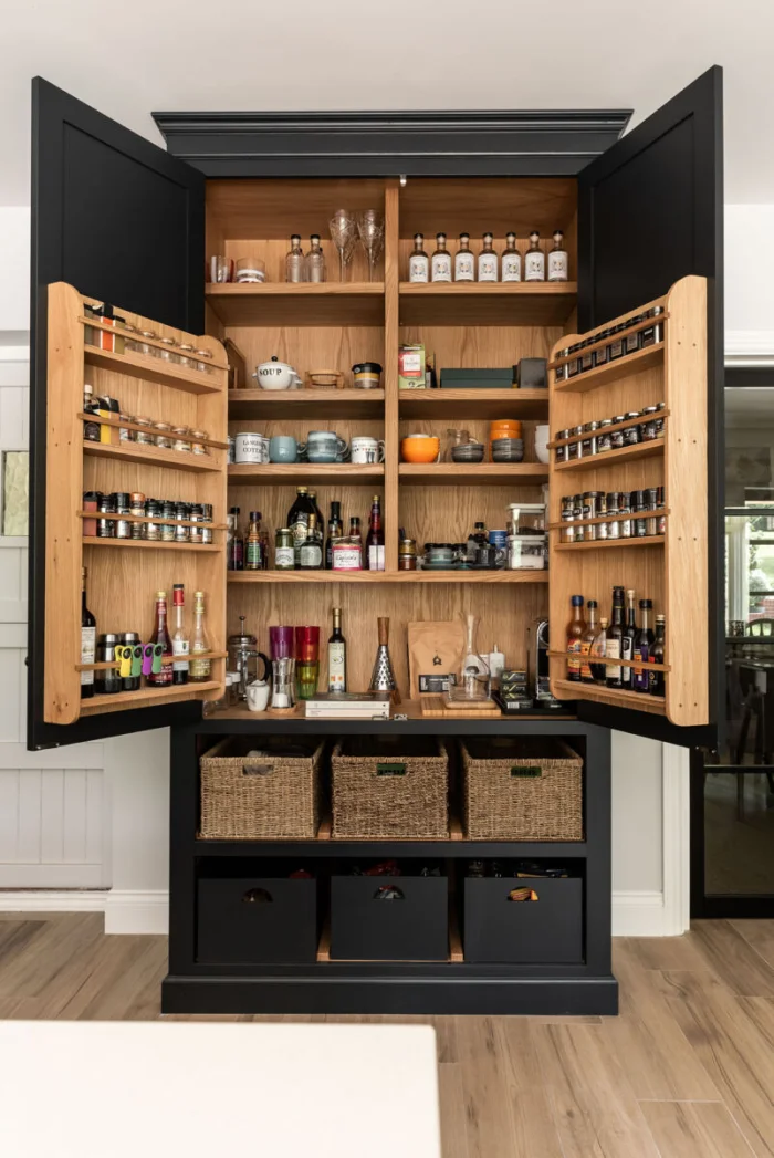 Даже узкий пенал-кладовка глубиной 30 см способен совершить революцию в хранении. Туда можно убрать запас продуктов, мелкую технику, бытовую химию. Освободившиеся полки на кухне скажут вам спасибо.