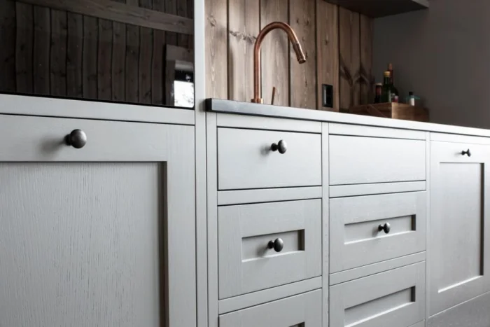 В тренде — фактурные фасады, которые имитируют отделку стен (штукатурка, бетон). Не сдают позиции гладкие матовые поверхности. В цвете правят сложные, приглушённые оттенки: серо-розовый (пыльная роза), серо-зелёный, глубокий сине-зелёный. И, конечно, натуральная фактура дерева и фанеры — вечная классика.