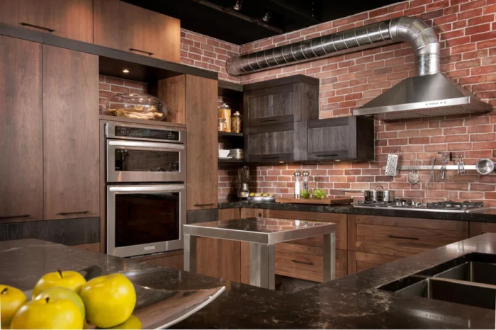 Это стиль для смелых. Сочетание грубоватой эстетики (кирпич, неоштукатуренные стены, открытые балки) с лаконичными формами. Он удивительно универсален: подойдёт и для маленькой кухни, добавив ей характера, и для просторного помещения, задав мощный урбанистический ритм.