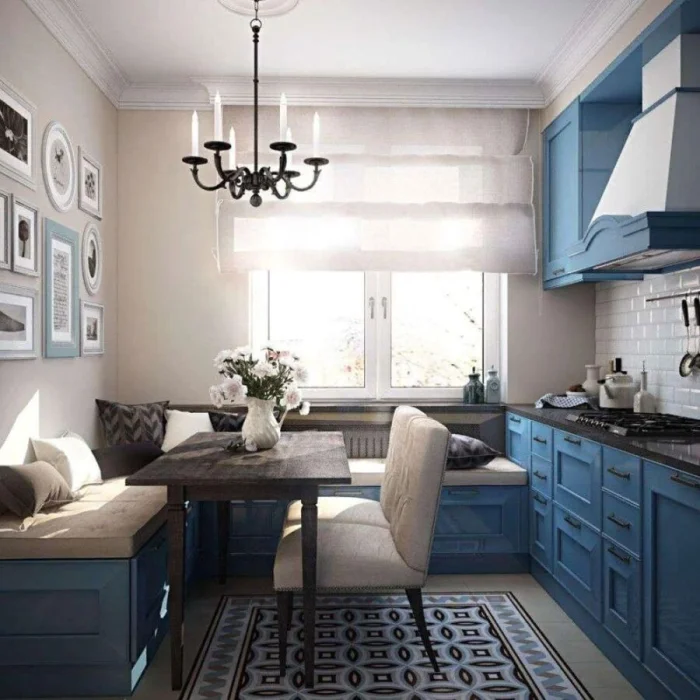 Массивные угловые диваны ушли в прошлое. Их место заняли компактные скамьи или узкие диванчики, которые можно дополнить декоративными подушками или тонким матрасом. Это стильная и эргономичная зона для короткого отдыха или завтрака.