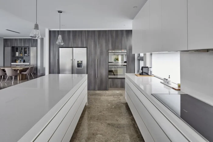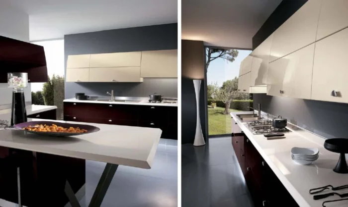 Толстенные каменные плиты сменяются изящными столешницами толщиной около 2 см. Но это не значит, что они хуже. Напротив, технологии позволяют делать их невероятно прочными. Экспериментируйте с цветом: можно сделать её продолжением фасадов или, наоборот, ярким контрастным акцентом.