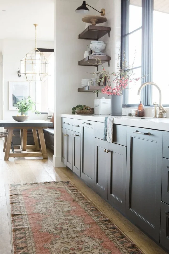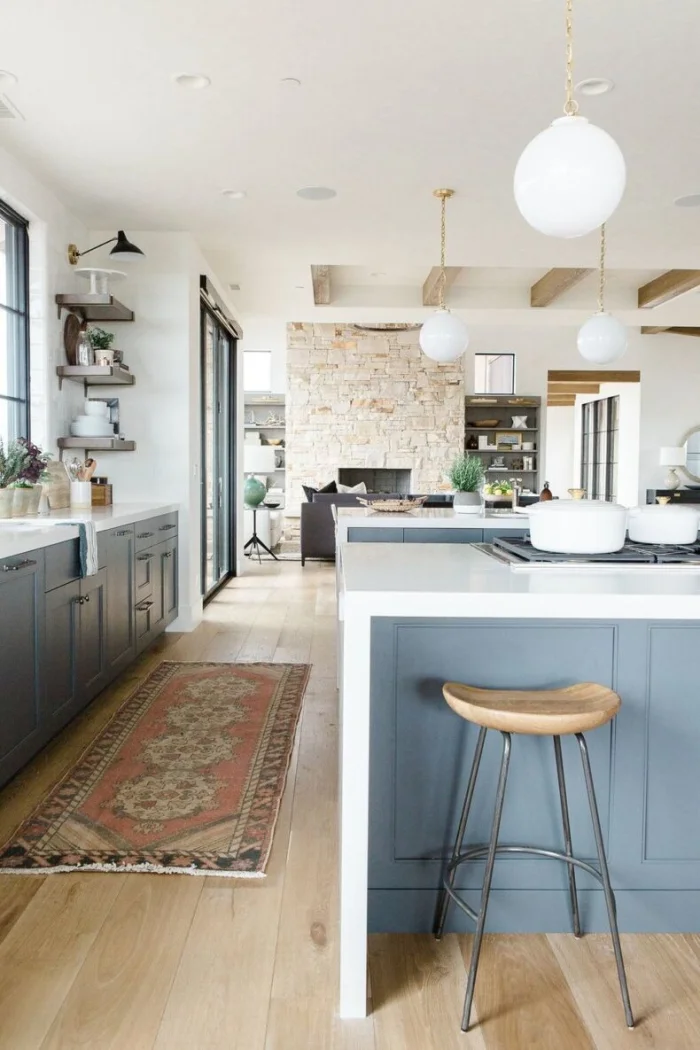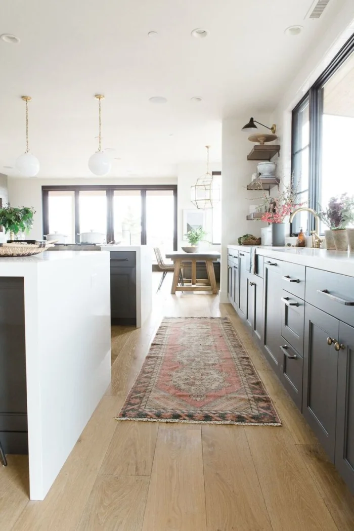 Самый простой и доступный способ зонирования. Идеально сочетается с другими методами. Пол на кухне можно сделать светлее, чем в гостиной. Или использовать разные материалы: практичную плитку в рабочей зоне и уютный ламинат в зоне отдыха.