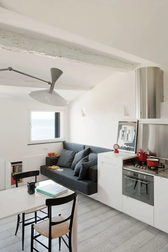 Если же вы питаетесь в основном доставкой, а готовка – necessity, то делайте ставку на зону отдыха. Обустройте уютный диван, большой телевизор, а кухонный блок спрячьте за изящной перегородкой.