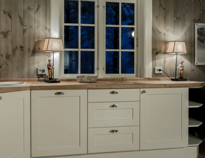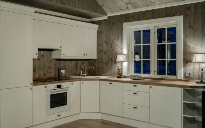 Мебель — массивная, из светлого дерева (ясень, сосна), часто с эффектом патины. Столешница может быть контрастной, темной, например, из темного камня или мраморированного пластика.