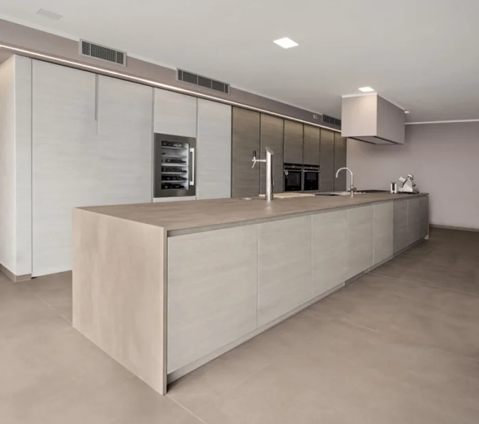 Вся техника полностью встраивается, ручки на фасадах часто отсутствуют (используется система push-open). Освещение продумывается до мелочей: скрытая светодиодная лента, точечные потолочные светильники, строгие подвесы над барной стойкой.