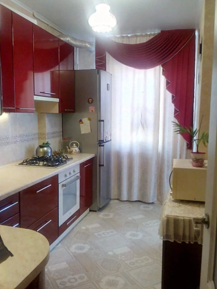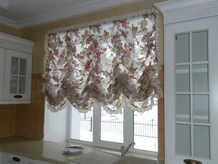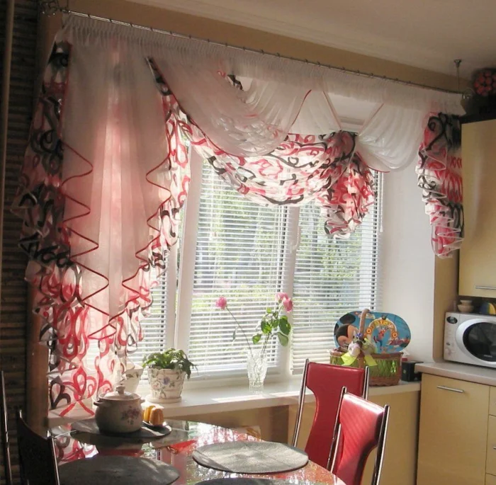- Арт-деко: Можно позволить себе лаконичный ламбрекен в паре с тюлем. Но для маленькой кухни от сложных конструкций лучше отказаться.