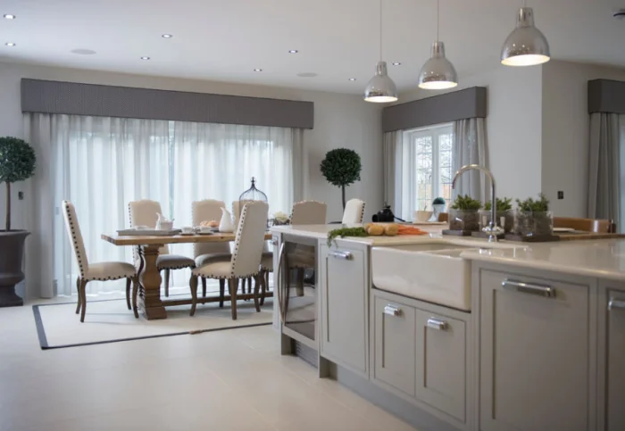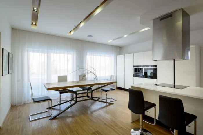 В просторных кухнях можно играть с двухслойными композициями и асимметричными формами. Вариантов — масса! Чтобы найти свой, просто посмотрите нашу галерею.