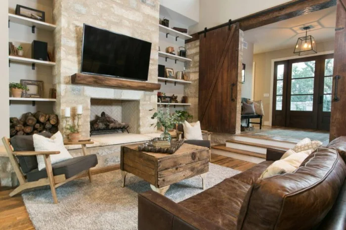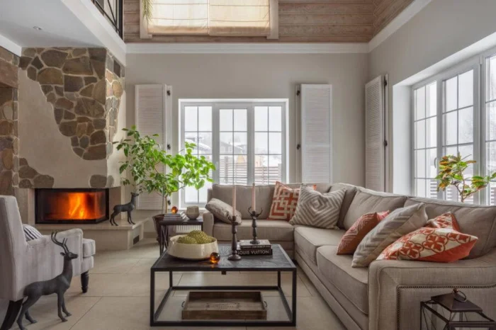 Классическая деревянная отделка отлично дружит с современными линиями мебели. Выбирайте натуральные материалы — дерево, камень, лен. И неважно, живете вы в загородном доме или в типовой панельке: создать атмосферу деревенского тепла можно где угодно.
