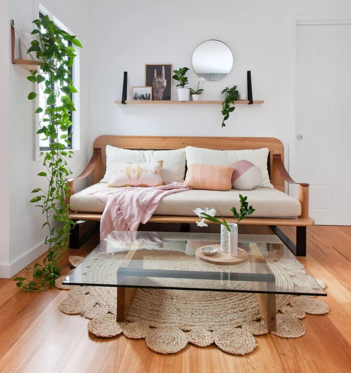 Текстиль — только натуральный: лён, хлопок, шерсть. Декор — керамические вазы, плетёные корзины, необработанный камень.