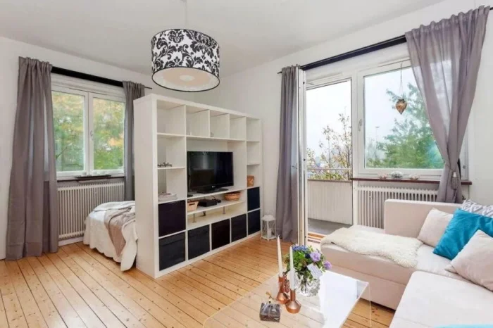 Как это сделать? Барной стойкой между кухней и гостиной, ширмой у кровати, подиумом, выделяющим зону отдыха. Прозрачные перегородки, стеллажи, текстиль, разное напольное покрытие — инструментов масса.