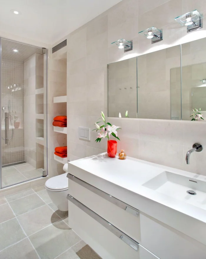 Уют создают детали. Небольшая картина в влагозащищённом багете, полка с любимой косметикой, живое растение (папоротник, сциндапсус, орхидея — они любят влажность). Их можно разместить на стене, на полу или даже подвесить к потолку.