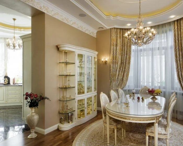 Для стиля арт-деко подойдёт белый тюль с золотым или серебряным шитьём. Шторы — в том же духе, но крой должен быть лёгким, чтобы не перегружать пространство.