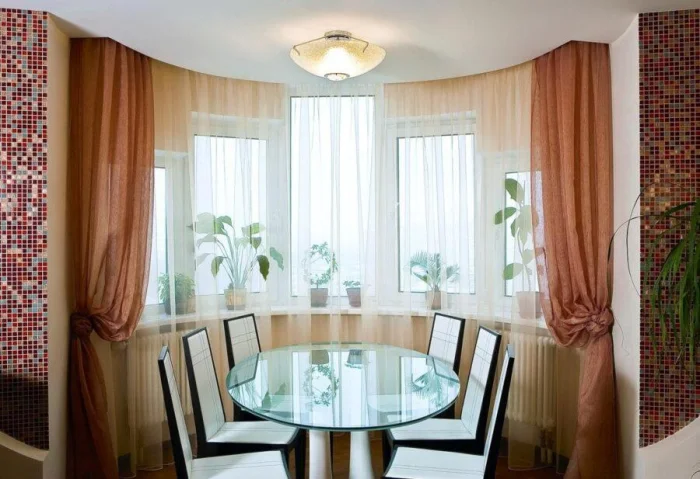 Для современной кухни-гостиной берите полупрозрачную органзу с матовым покрытием. Можно поэкспериментировать с кроем по косой и специальными держателями. А вот от атласа на кухне лучше отказаться: он быстро пачкается и сложен в уходе.
