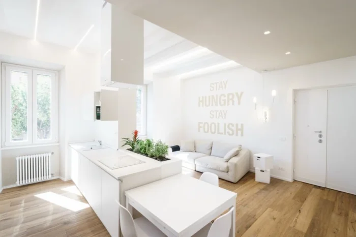 - Минимализм. Философия «ничего лишнего» — спасение для малогабариток. Четкие линии, скрытые системы хранения, монохромная или нейтральная палитра. Каждый предмет на счету и выполняет функцию.