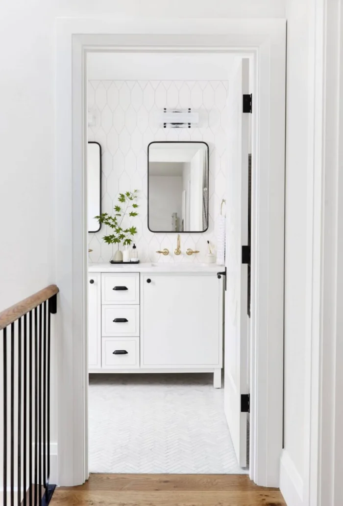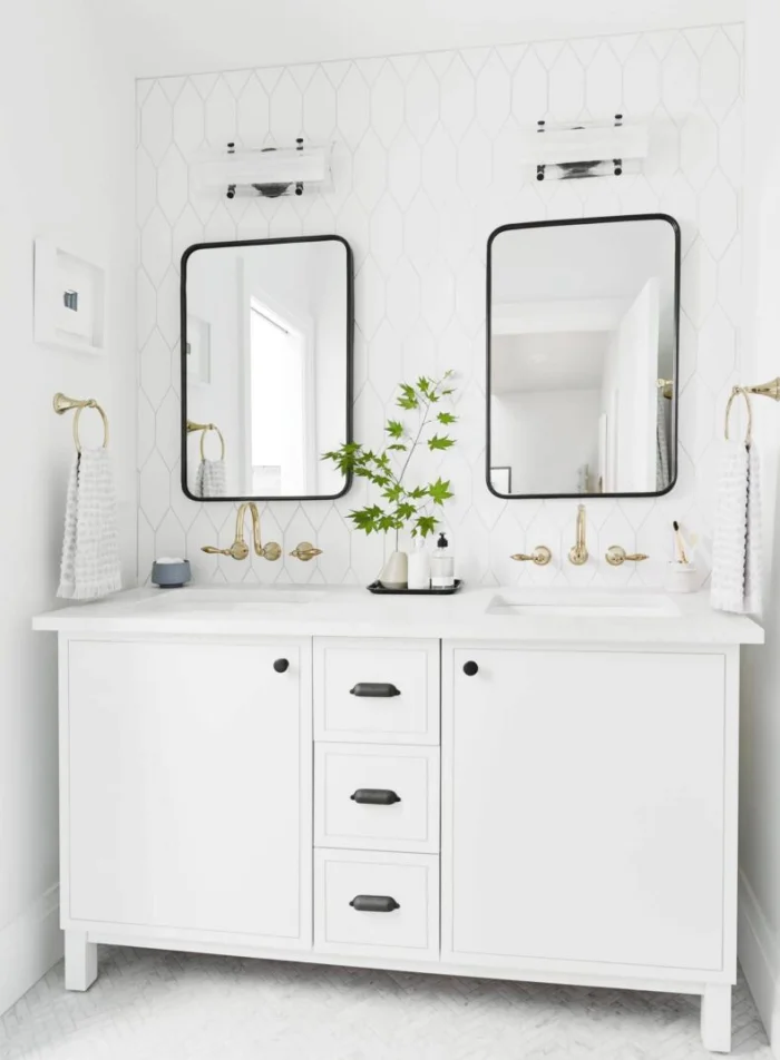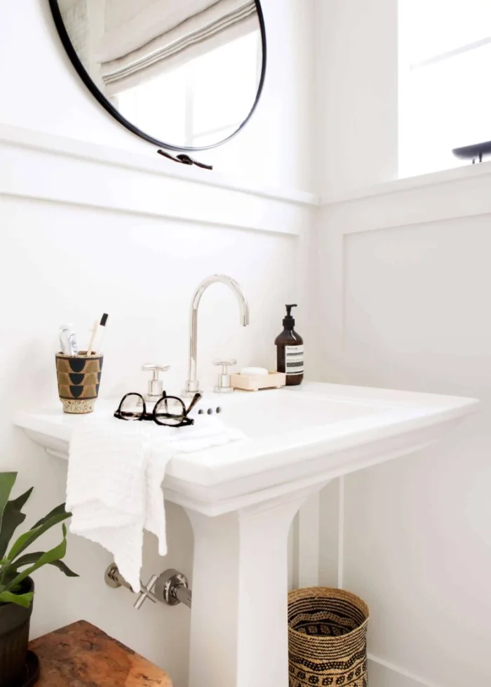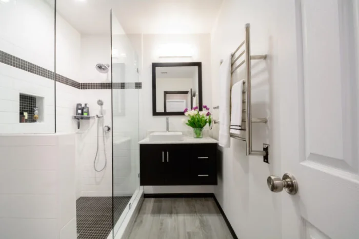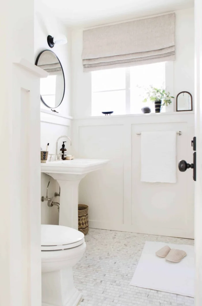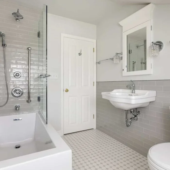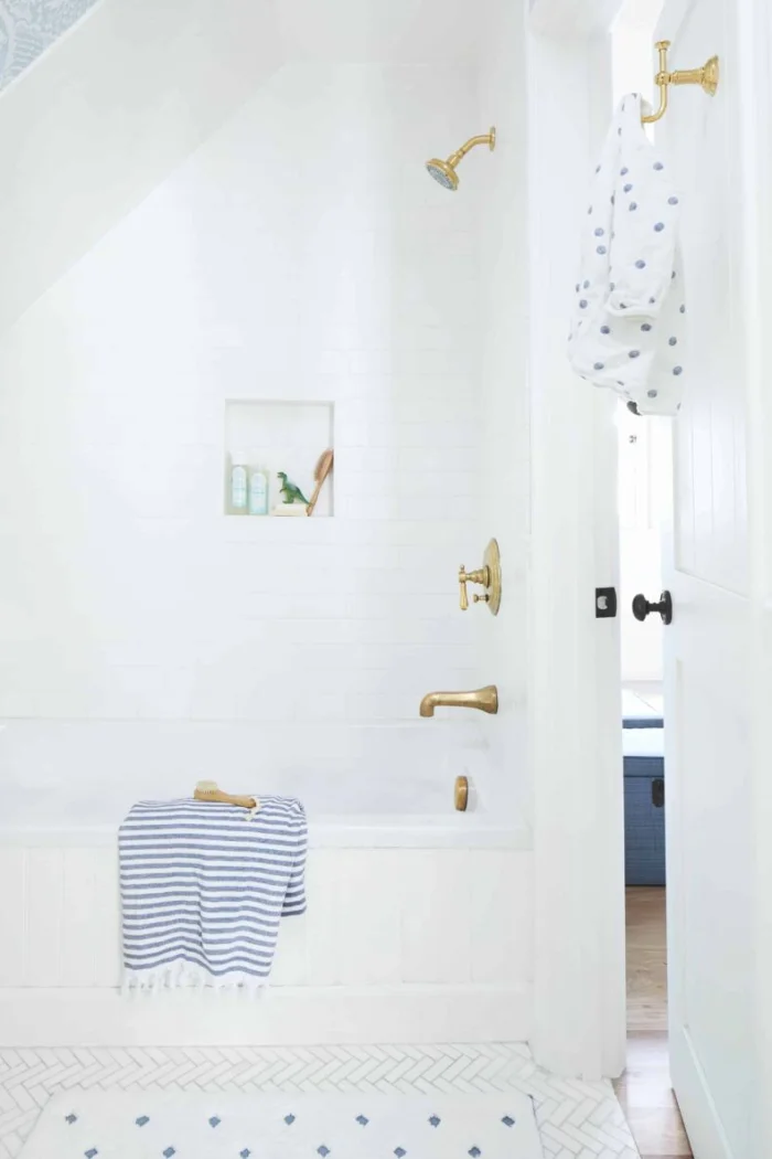 Светлая основа — закон. Но монохромный белый может превратить ванную в стерильный бокс. Разбавьте его! Добавьте один-два акцентных цвета через аксессуары: полотенца, коврик, держатели. Или сделайте одну контрастную стену.