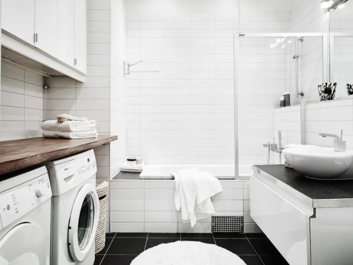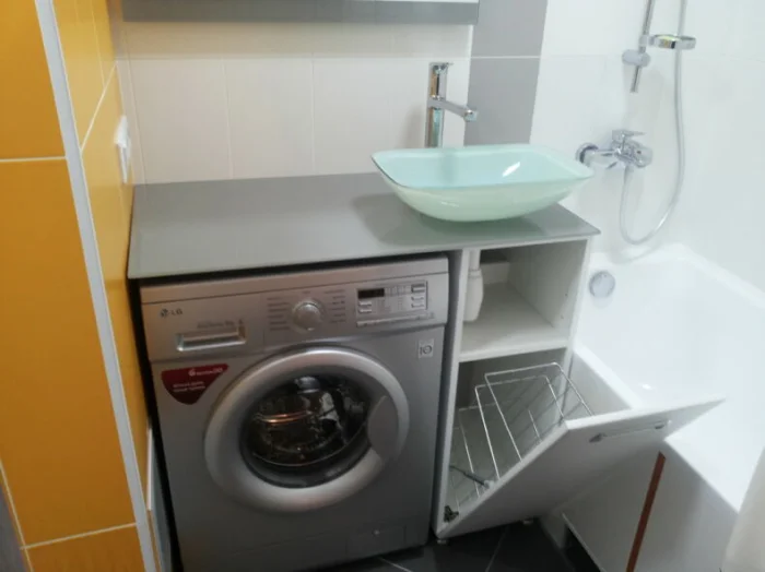 - Куда деть стиралку? Если втиснуть машинку в ванную не получается, не мучайтесь. Коридор, кухня, ниша под лестницей — вариантов много. Дизайн маленькой ванной без стиральной машины — это нормально.