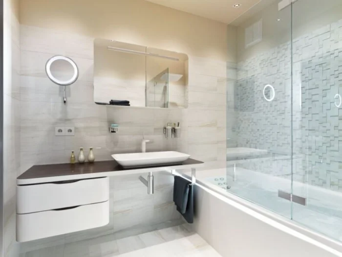 Решающий вопрос: ванна или душ? Ванна оправдана, если есть дети или вы фанат долгих заплывов. Во всех остальных случаях душевая кабина — рациональный выбор. Современные модели с низким поддоном или вовсе без него (трап в полу) выглядят стильно и экономят пространство.