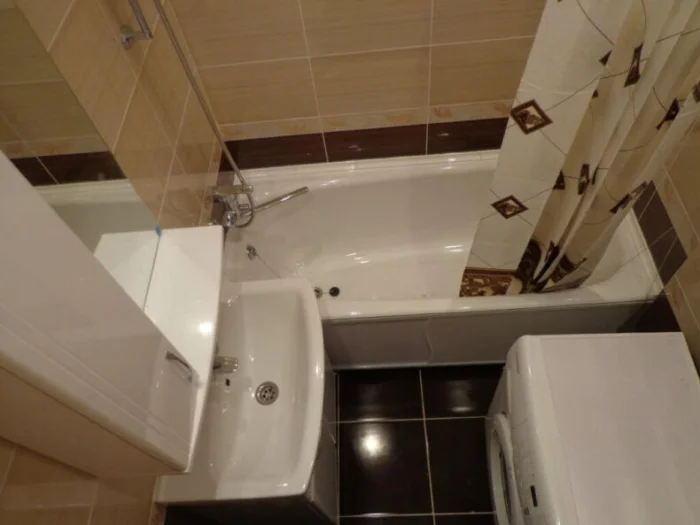 Раковину выбирайте компактную, лучше округлой формы (углы травмоопасны в тесноте). Стиралку можно спрятать под столешницу или выбрать узкую модель.
