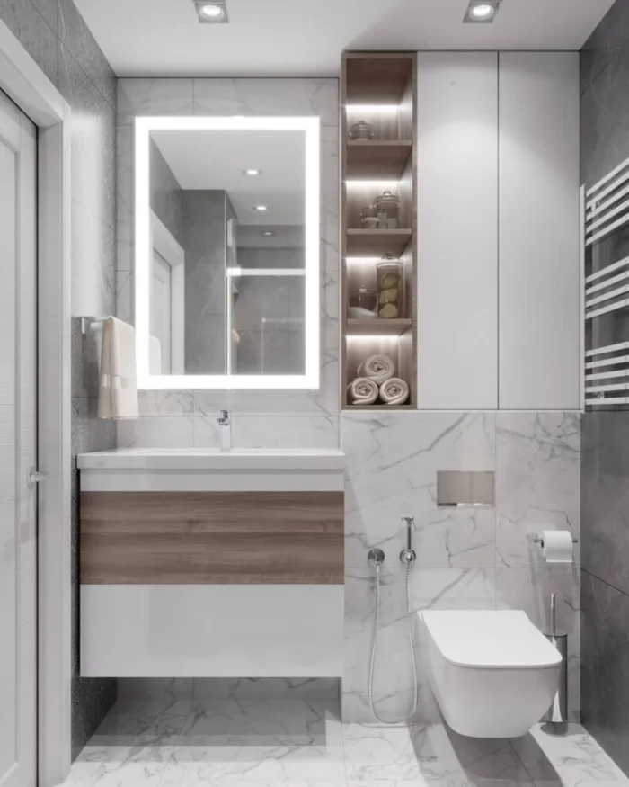 - Подсветка в нишах или за зеркалом создаст уютную атмосферу.