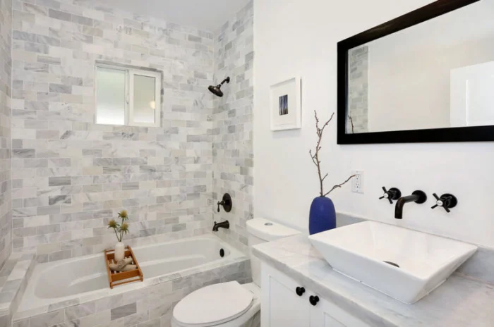 - Большая плитка вместо мелкой. Забудьте стереотип, что для маленькой ванной нужна только мелкая плитка. Крупный формат (например, 30х60 см) с минимальным количеством швов, наоборот, зрительно увеличивает пространство.