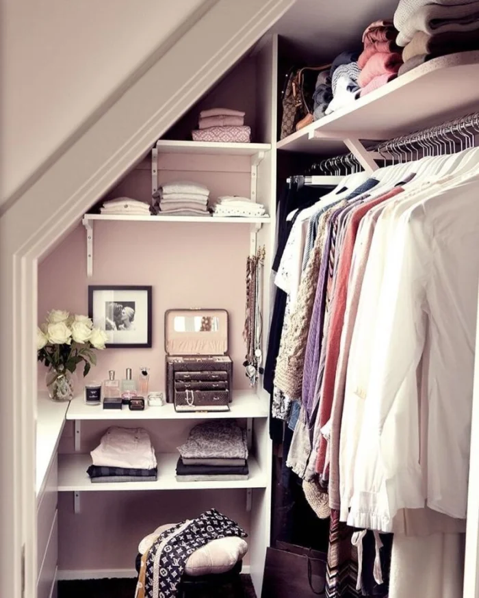 - Универсальность расположения. Нет отдельной комнаты? Не беда. Гардеробную можно вписать в просторную прихожую, под лестницу, в мансарду или соорудить из гипсокартонной перегородки. Идеи ограничены только вашей фантазией и метражом.