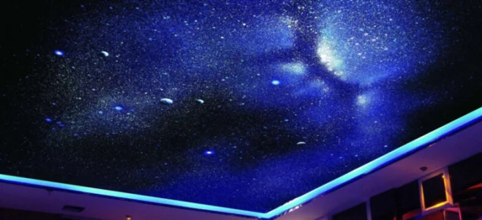 Есть разные подходы к созданию космоса над головой. Бюджетный — полотно с фотопечатью галактики и контурной лентой по краю. Более сложный — оптоволокно, где свет передается по нитям к точкам на потолке. Самый же роскошный вариант использует рассеиватели из хрусталя Swarovski.