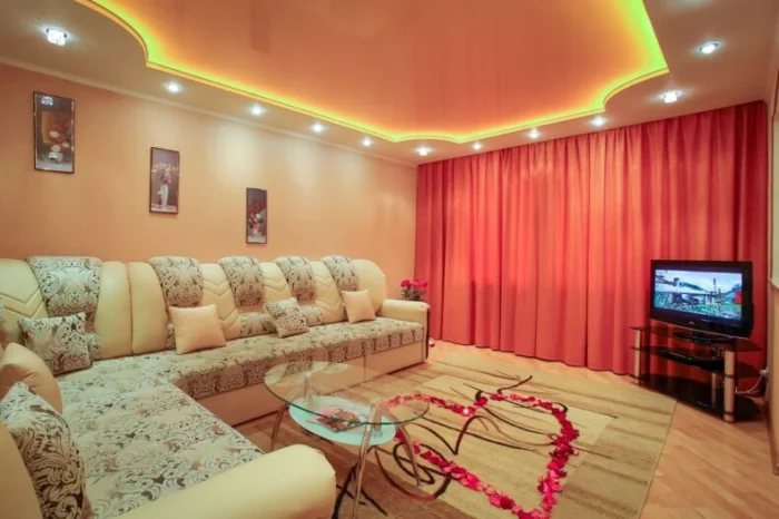 - Многоуровневые конструкции со светодиодной лентой, спрятанной за гипсокартонным бортом;