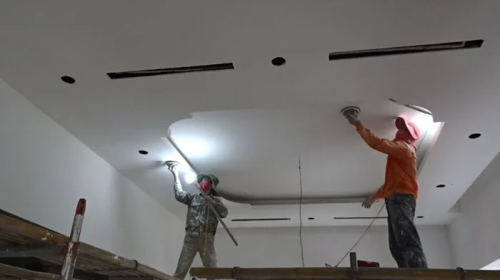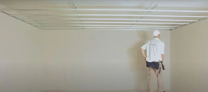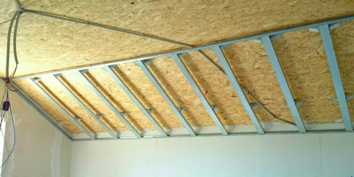 Сначала собирают каркас из металлических профилей, тщательно выверяя уровни. Для многоуровневого потолка профили крепят на разной высоте. Параллельно разводят проводку для будущих светильников.
