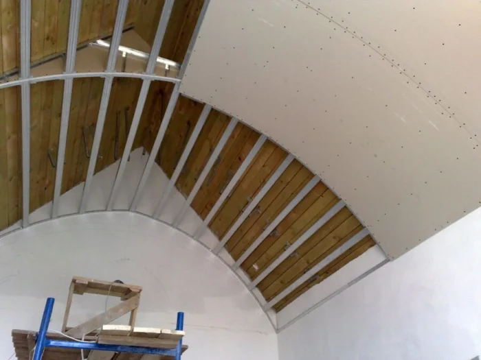 Затем к каркасу крепят листы гипсокартона, предварительно придав им нужную форму. Стыки должны быть идеально подогнаны.