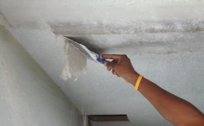Тут нужна сноровка и подготовка. Из инструментов — стремянка, широкий шпатель, валик, плёнка для пола и средства защиты (очки, кепка — мусор будет сыпаться прямо на вас).