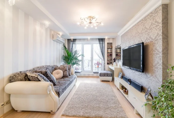 - Соблюдайте пропорции. Воспользуйтесь правилом 60/30/10. 60% площади — основной цвет (стены, крупная мебель). 30% — дополнительный цвет (шторы, ковёр, обивка). 10% — акценты (подушки, вазы, картины).