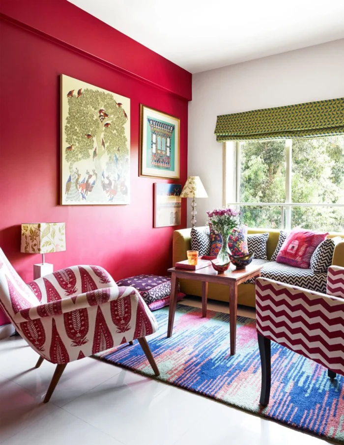 Это, пожалуй, самый популярный и эффектный способ. Одна стена становится ярким пятном, арт-объектом, а остальные три — сдержанным фоном для неё. Главное правило: не переборщить с насыщенностью фоновых оттенков. Идеальный фон — однотонный или с микроузором.