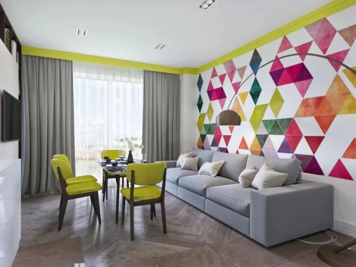 Для плавного перехода между цветами используйте нейтральную буферную зону — например, стену с мелким абстрактным узором между двумя однотонными плоскостями.