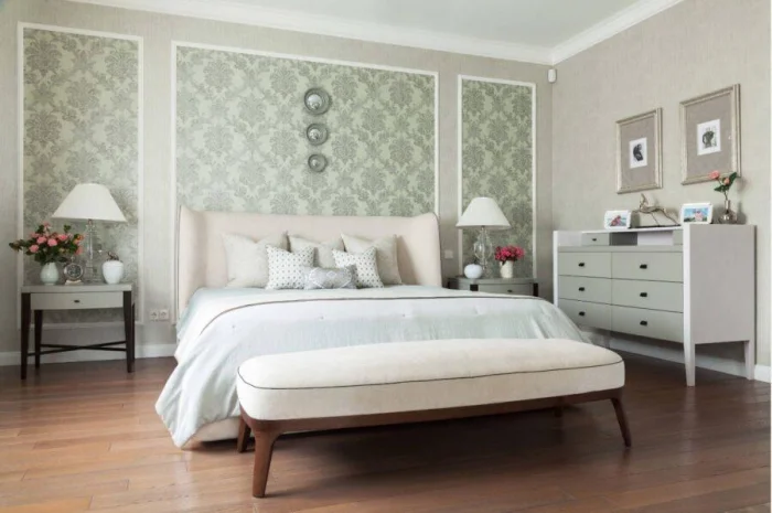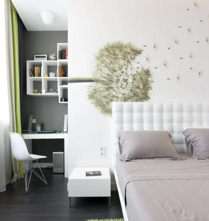 Здесь главный принцип — не перегрузить. Для спальни выбирайте нейтральный фон, а акцент сделайте только в изголовье кровати (флористика, абстракция, мягкие фотообои). Яркий крупный рисунок напротив кровати может мешать расслаблению, но это вопрос личных предпочтений. В любом маленьком помещении верные друзья — пастельная гамма и вертикальные полосы для высоты.