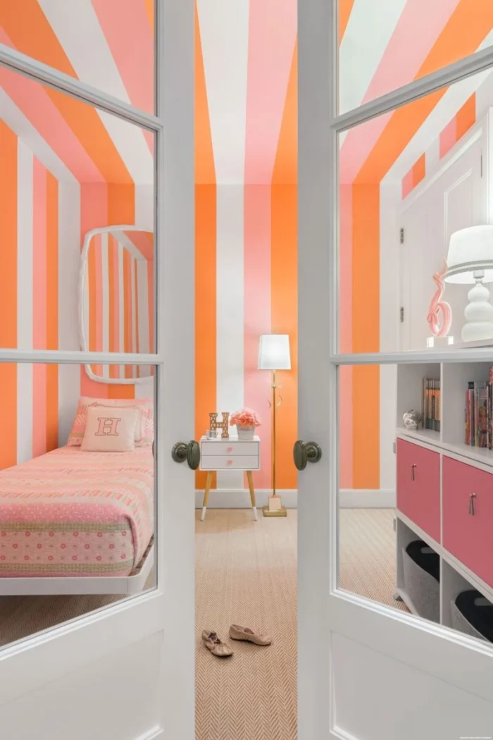 - Детская. Полоска должна вдохновлять! Сделайте одну стену с ярким рисунком или геометрическим орнаментом. Это создаст динамику и настроение для игр.