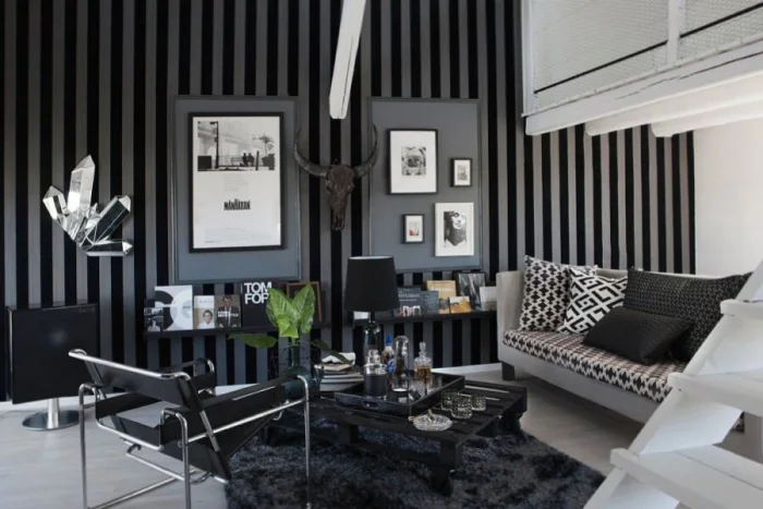 - Чёрные полоски — строгость и безупречность. Требуют ярких цветовых пятен в декоре, иначе комната станет мрачной.