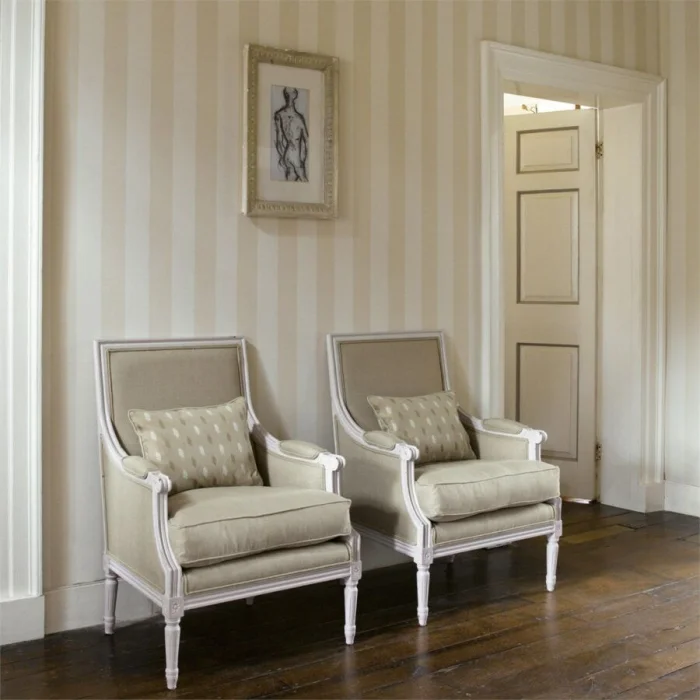 Хотите добавить классическому интерьеру драматизма? Выбирайте полоски с золотым или серебряным шиммером. Они завораживают игрой света. Отлично работают в эклектике, где смешиваются современные и классические элементы. Главное — не переборщить с количеством.
