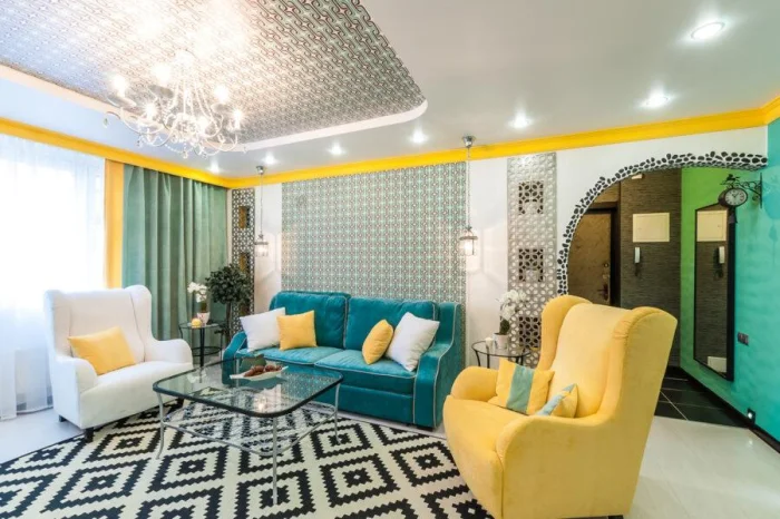 - Большой просторный зал? Можно смело брать крупный рисунок и глубокие, насыщенные тона.