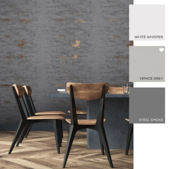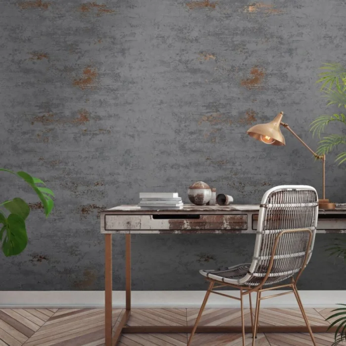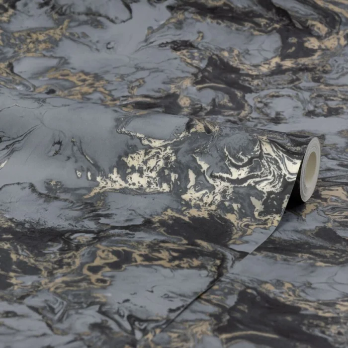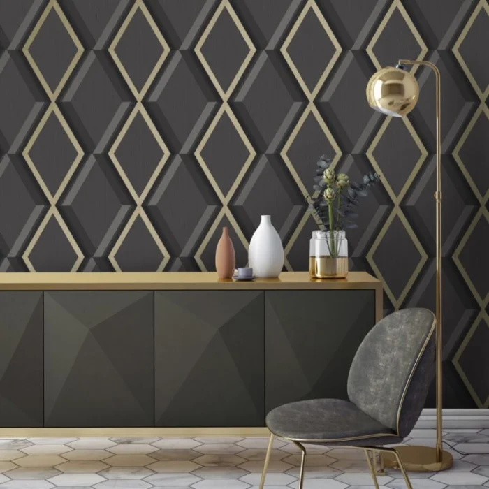 Темные обои с металлизированными вставками или блестящим принтом — тренд для смелых интерьеров в стиле лофт или хай-тек.