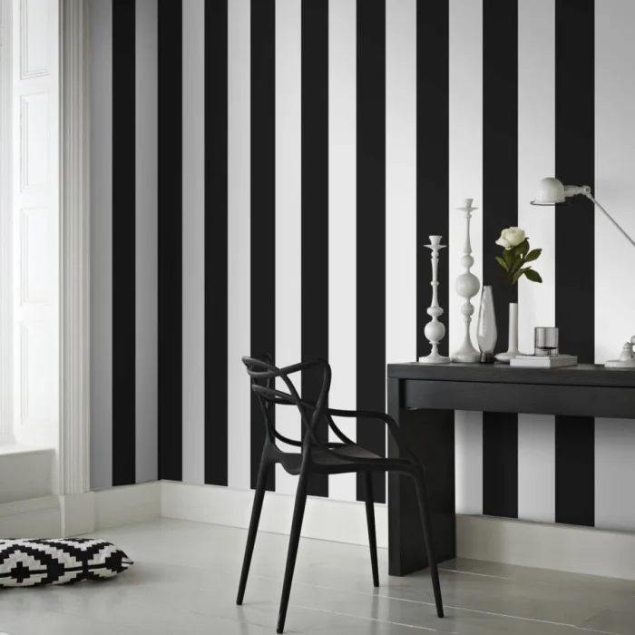 Обои в полоску, где чередуется белый и черный цвет необходимо клеить на ровную поверхность. Есть также варианты произвести монтаж на потолок. Этот вариант больше подходит для творческих и неординарных личностей, чаще всего метод используется в частных домах.