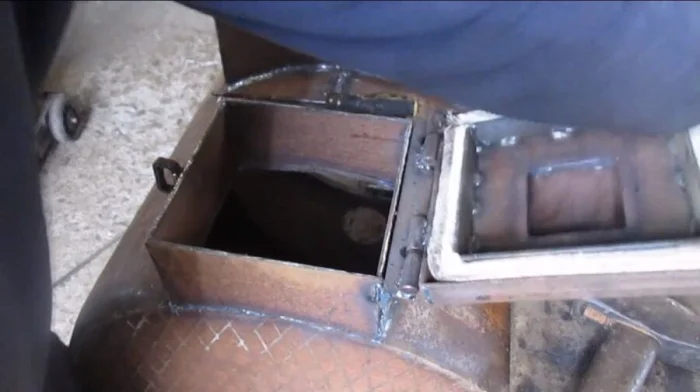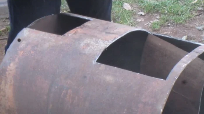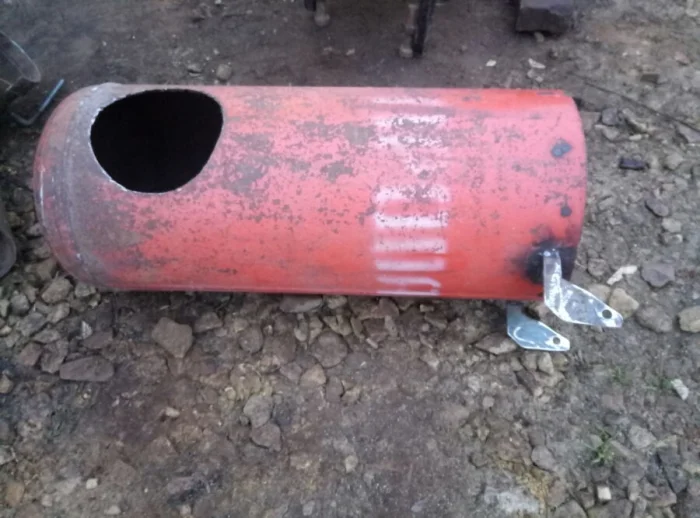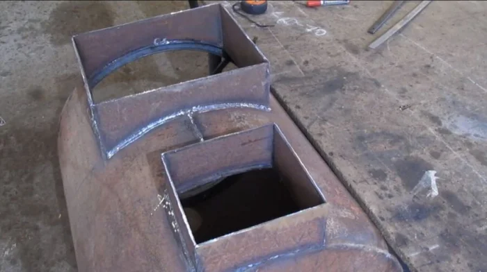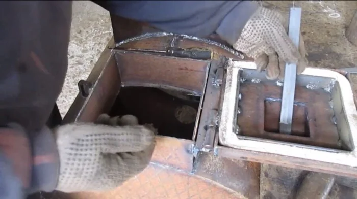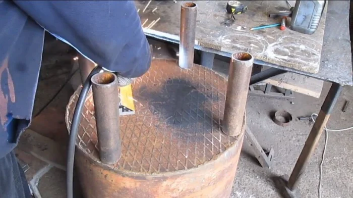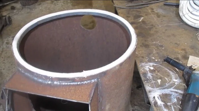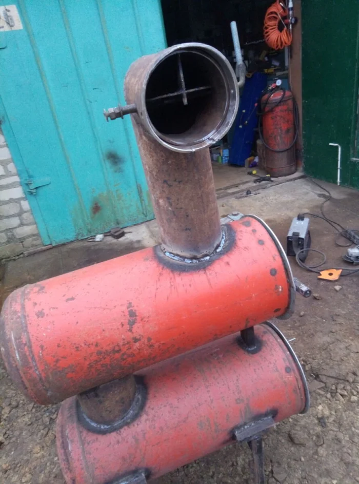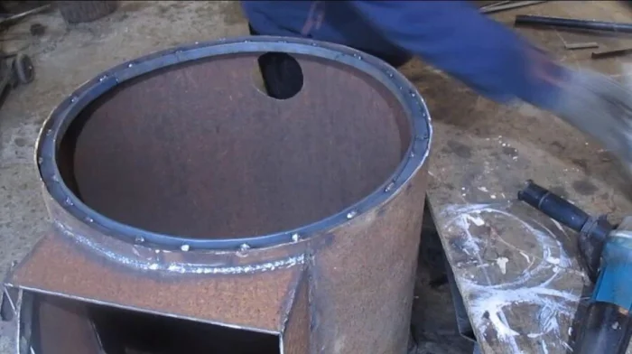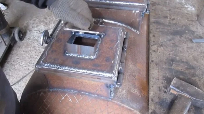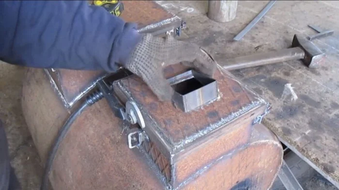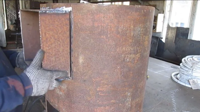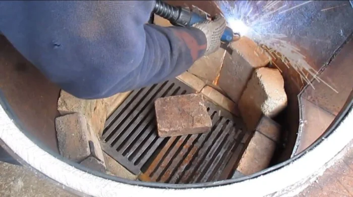 Ваша задача — грамотно врезать дверцы для закладки топлива и чистки, а также организовать отвод дыма. Внутри также нужно закрепить колосниковую решётку, подставив под неё опоры из уголка или арматуры. Главный плюс — минимальное количество сварочных работ.