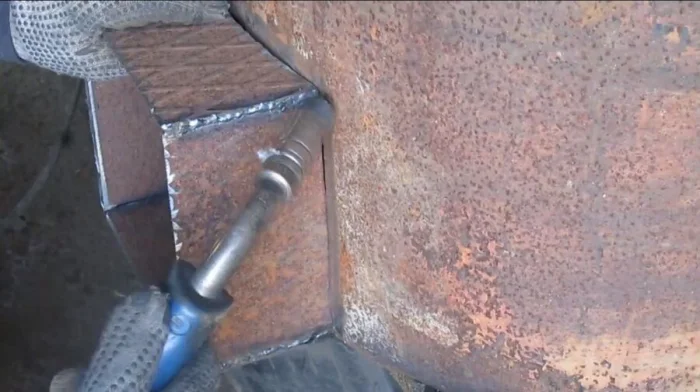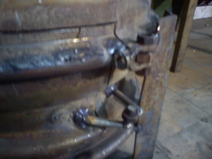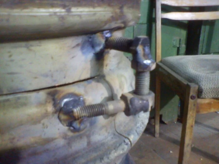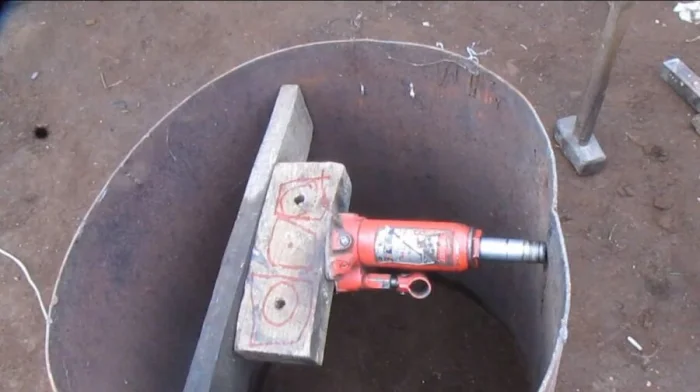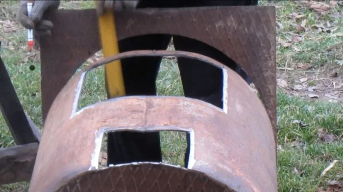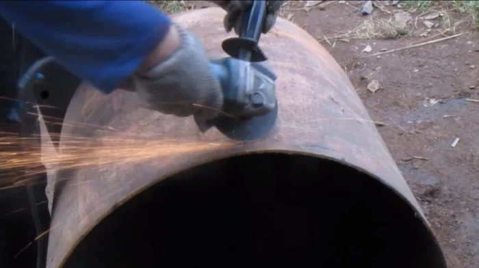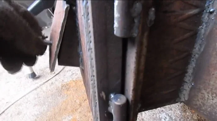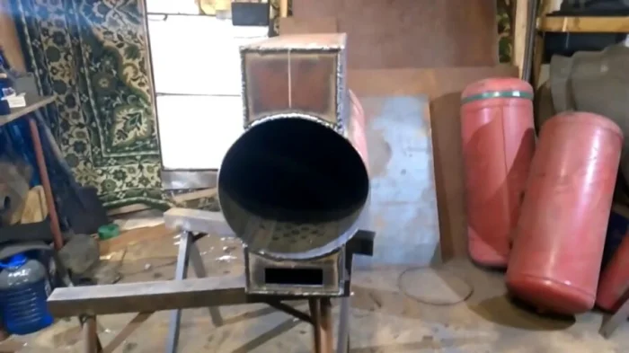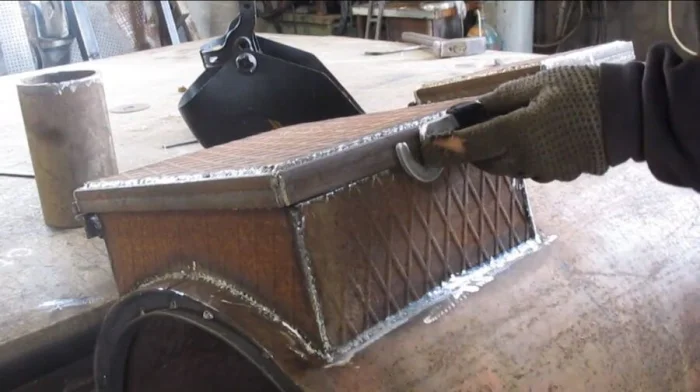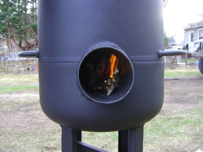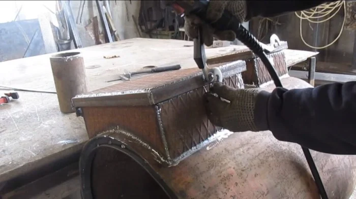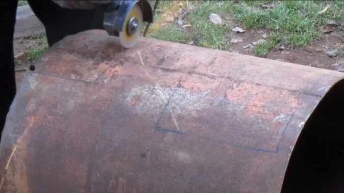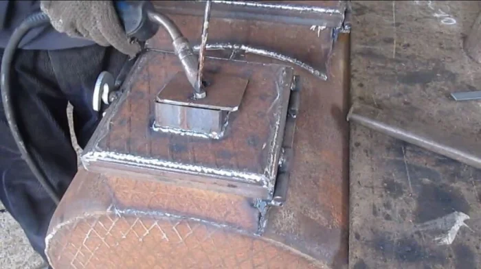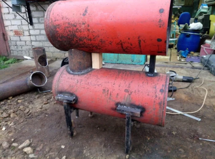 Ваша задача — грамотно врезать дверцы для закладки топлива и чистки, а также организовать отвод дыма. Внутри также нужно закрепить колосниковую решётку, подставив под неё опоры из уголка или арматуры. Главный плюс — минимальное количество сварочных работ.