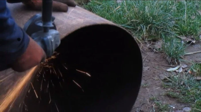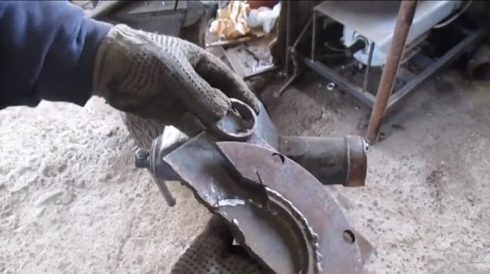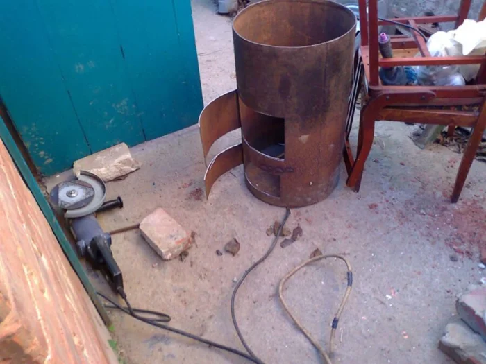 Финишные штрихи: приварите ножки и патрубок для дымохода в верхней части задней стенки или верха. Все острые кромки и заусенцы зачистите болгаркой. Печь почти готова.