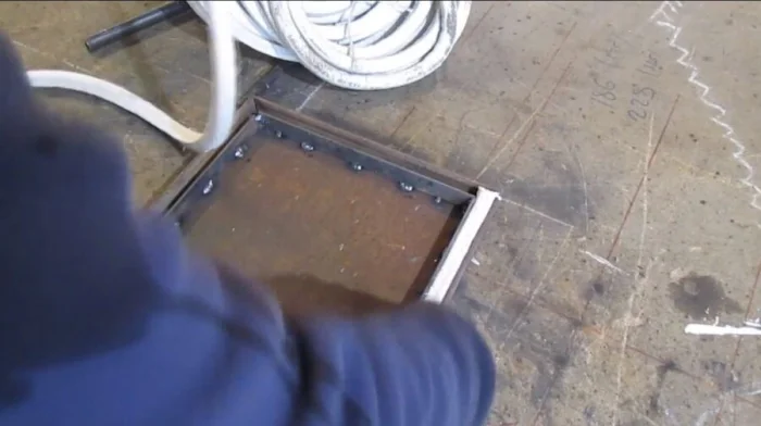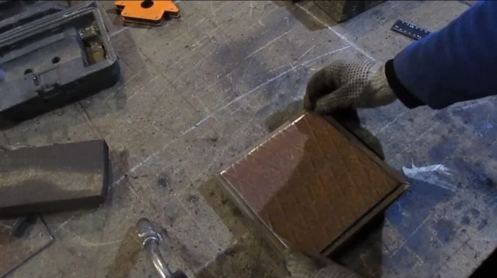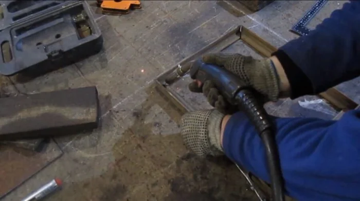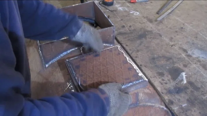- С помощью сварки соберите короб. Сначала прихватывайте детали точечно, проверяя уровнем прямоугольность, затем проварите швы сплошным швом.