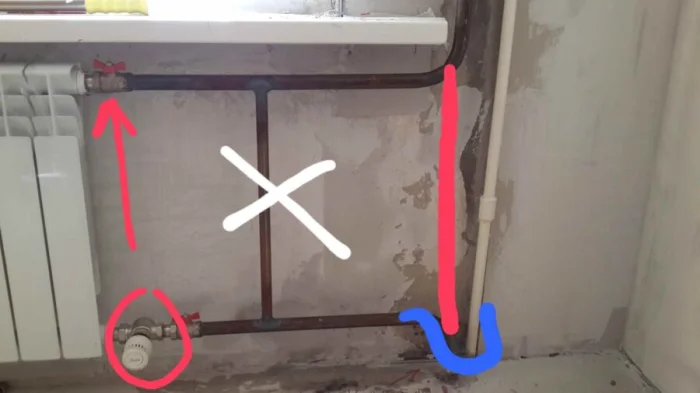 Здесь возможны несколько ошибок. Например, батарея висит с обратным уклоном. Или подключена не той стороной. Но самая частая и критичная ошибка — это отсутствие или неправильная установка байпаса.